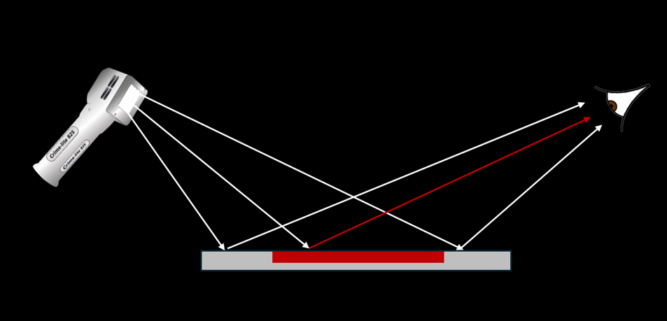 This optical principle is useful in for blood detection. Light-coloured substrates typically reflect a high proportion of the incident white light, therefore appearing light to the observer. This then creates contrast with dried blood absorbs which much of the light, resulting in a distinct red-brown appearance. This contrast is what gives visibility to bloodstains and facilitates the location of potential bloodstains during visual searches.