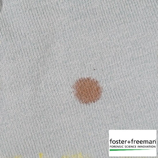 In this example, the bloodstain is completely invisible under white light. However, when examined using fluorescence, the stain itself fluoresces, making it stand out clearly against the background.